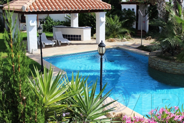 De woning beschikt over 2 meter plus hoge muren rond 1200 vierkante meter aangelegde tuinen met detectiepoortjes en automatische nachtverlichting via wand lantaarns en lantaarnpalen aan de belangrijkste poorten, oprit , parkeerplaatsen en het zwembad plus extra schakelbare gekleurde verlichting om alle plantaardige bedden , up - verlichting om bomen , gangen , patio's , barbecue , poolhouse , enz. palm voor 's nachts feesten